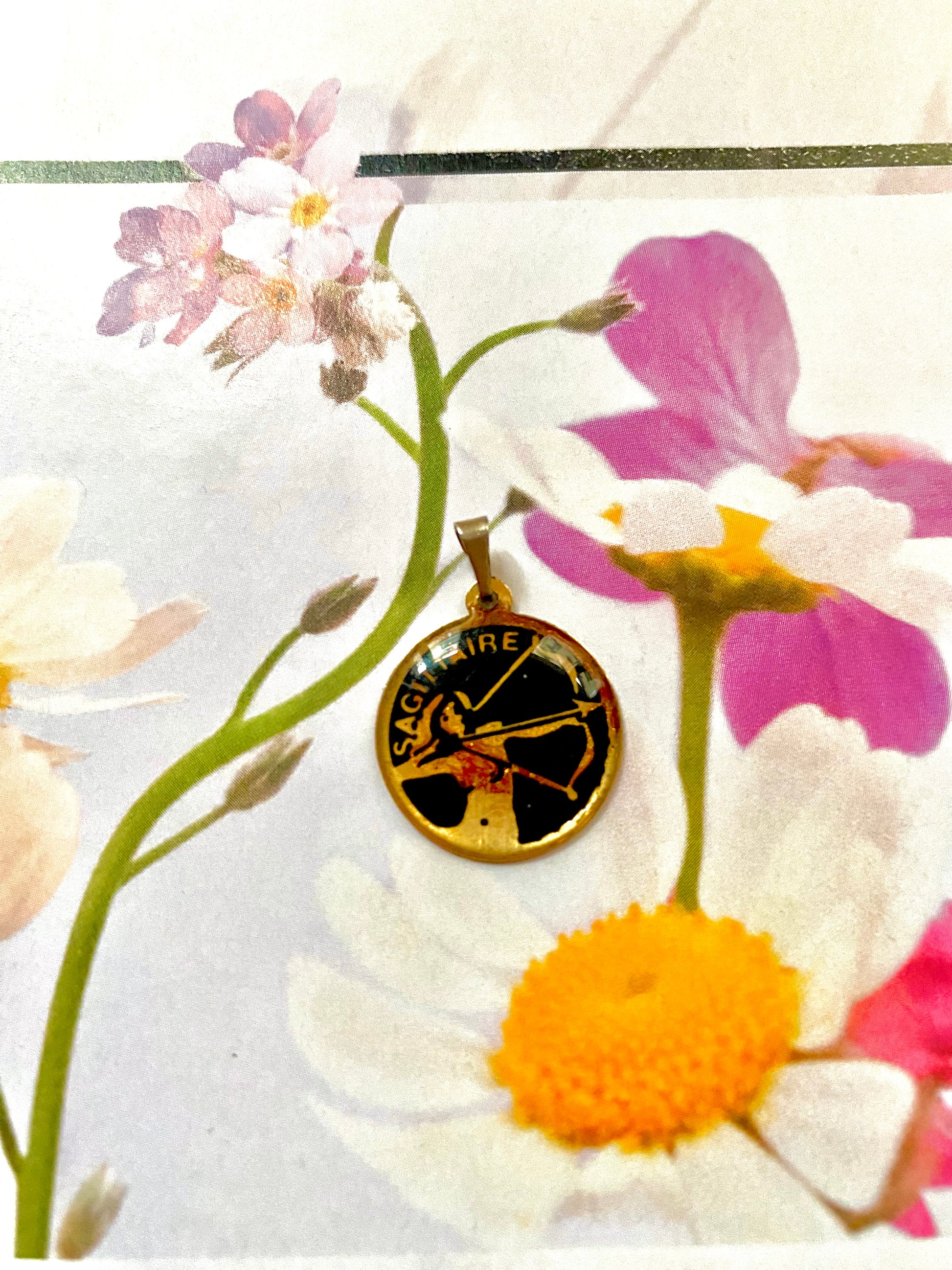 Pendentif en plaqué or vintage du signe sagittaire, quelques signes d’usures due au temps mais splendide pièce unique.