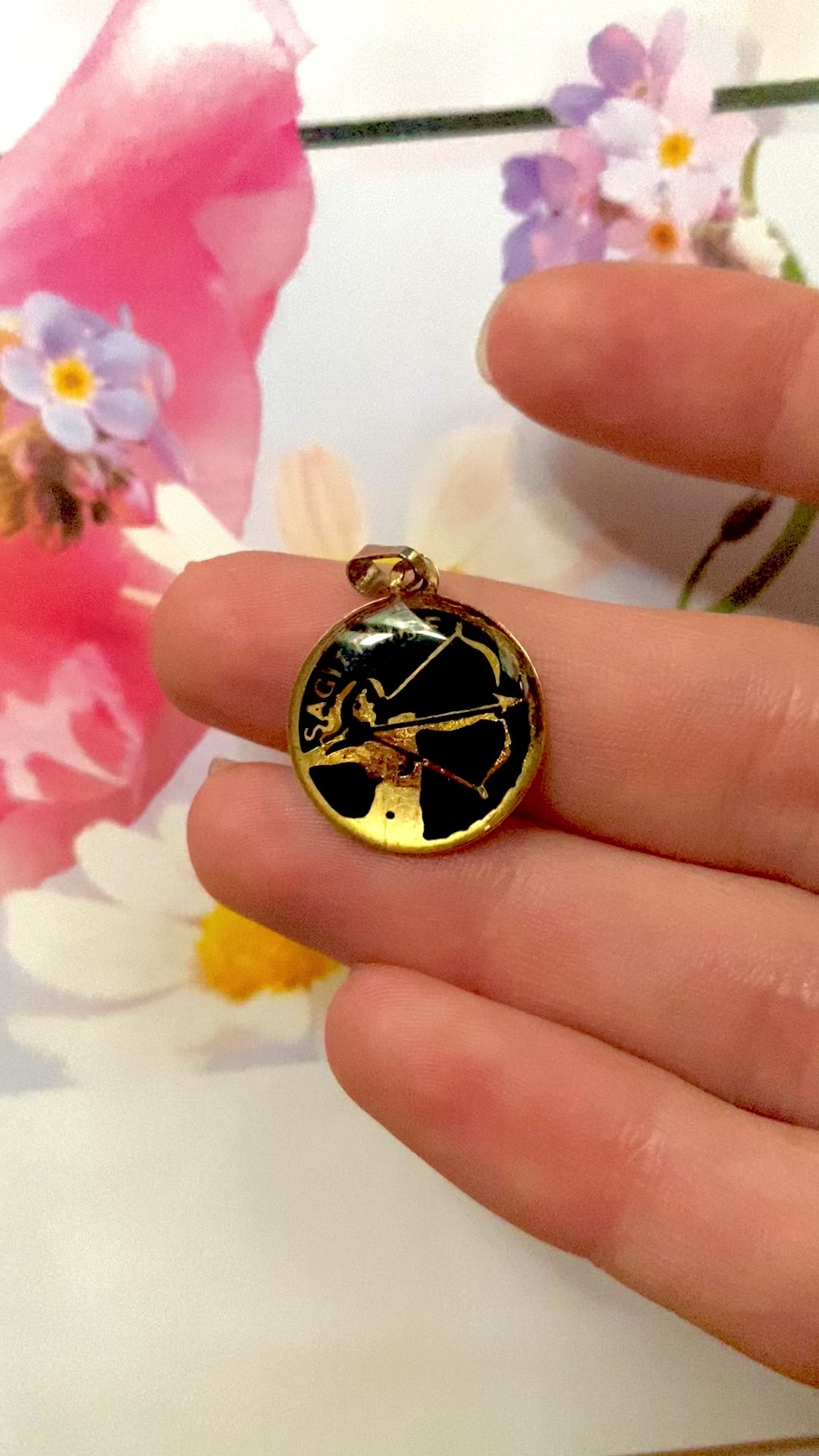 Vintage gold plated pendant of the Sagittarius sign, some signs of wear due to time but splendid unique piece.