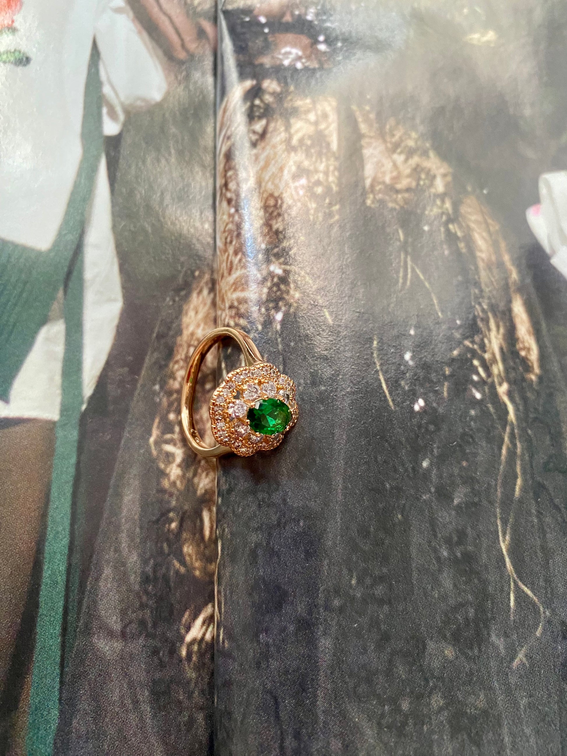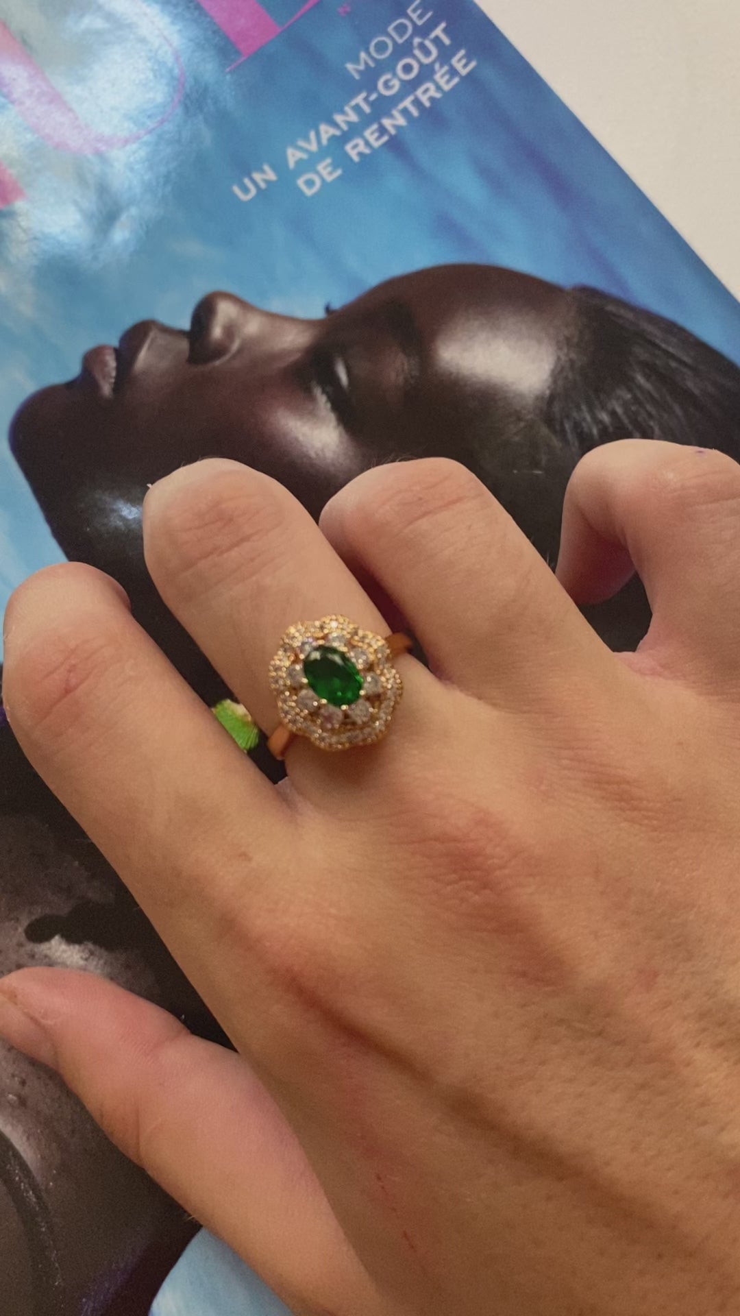 Bague en plaqué or sertie de zirconiums et d’une pierre verte. Taille 54fr. Poinçonnée.
