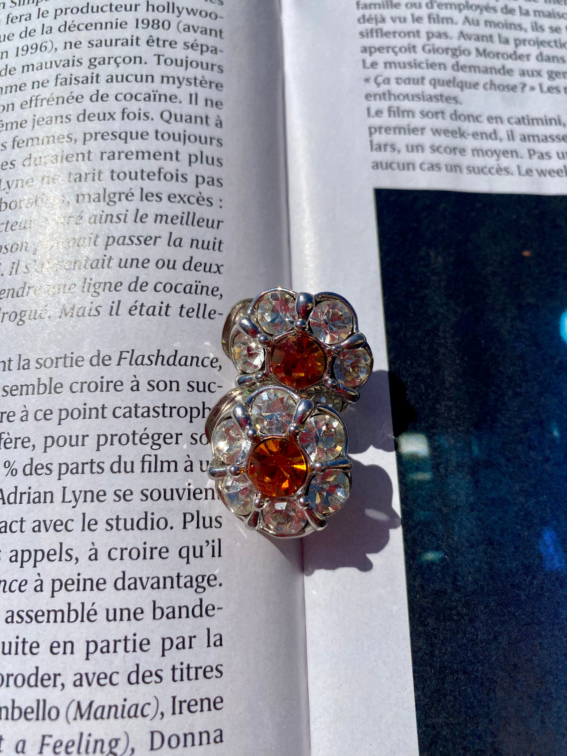 FR/ Clips fleurs des années 40 avec des gros cristaux blancs et orangés. Paire parfaite pour un look chic et tendance. La brillance est intense. Cette paire match autant avec un t-shirt et un jean qu’avec une robe habillée.