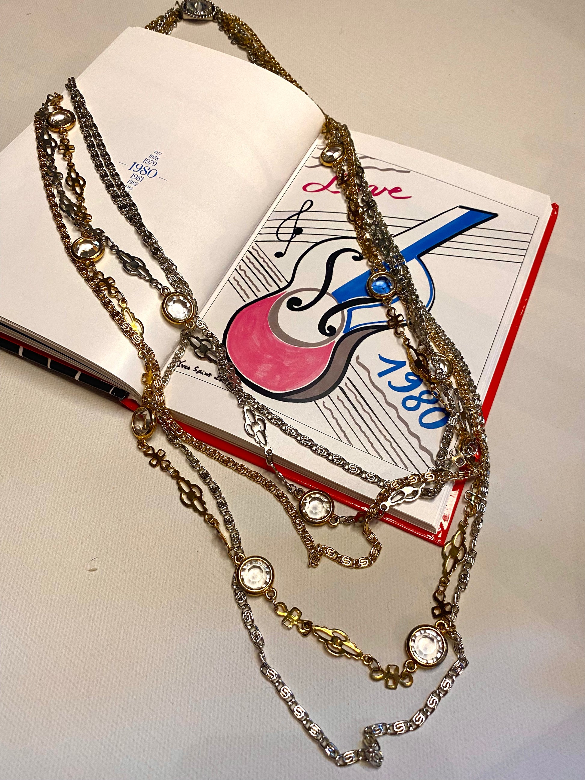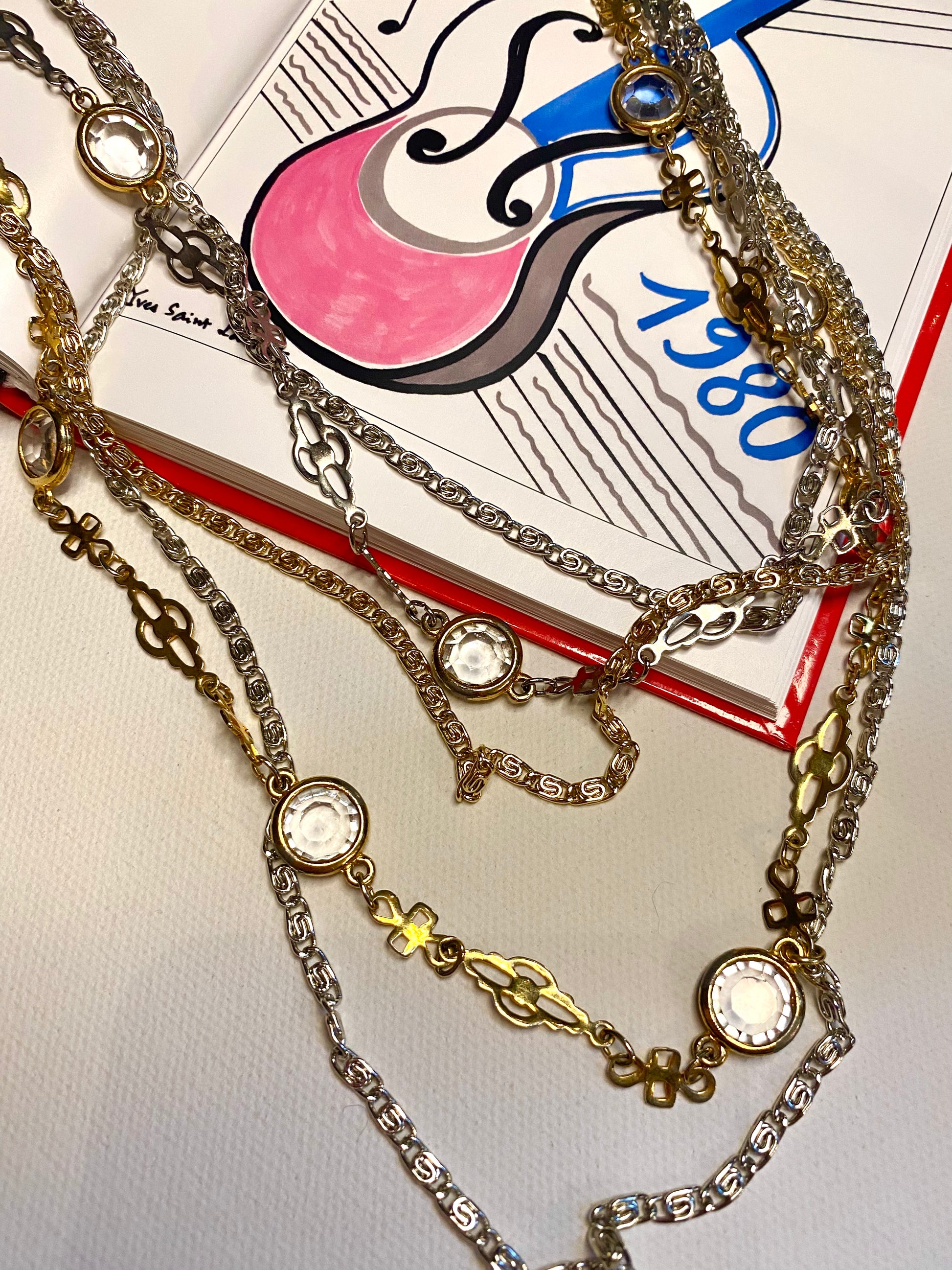 Sautoir vintage multi rangs qui peut se porter de plusieurs manières différentes. Il est en plaqué or et argent avec des gros strass. Le fermoir est très raffiné et original, le sautoir étant très long il peut se porter en faisant un ras de cou avec le fermoir devant qui vaut la peine d’être mis en valeur et on peut continuer les tours autant que cela est possible.