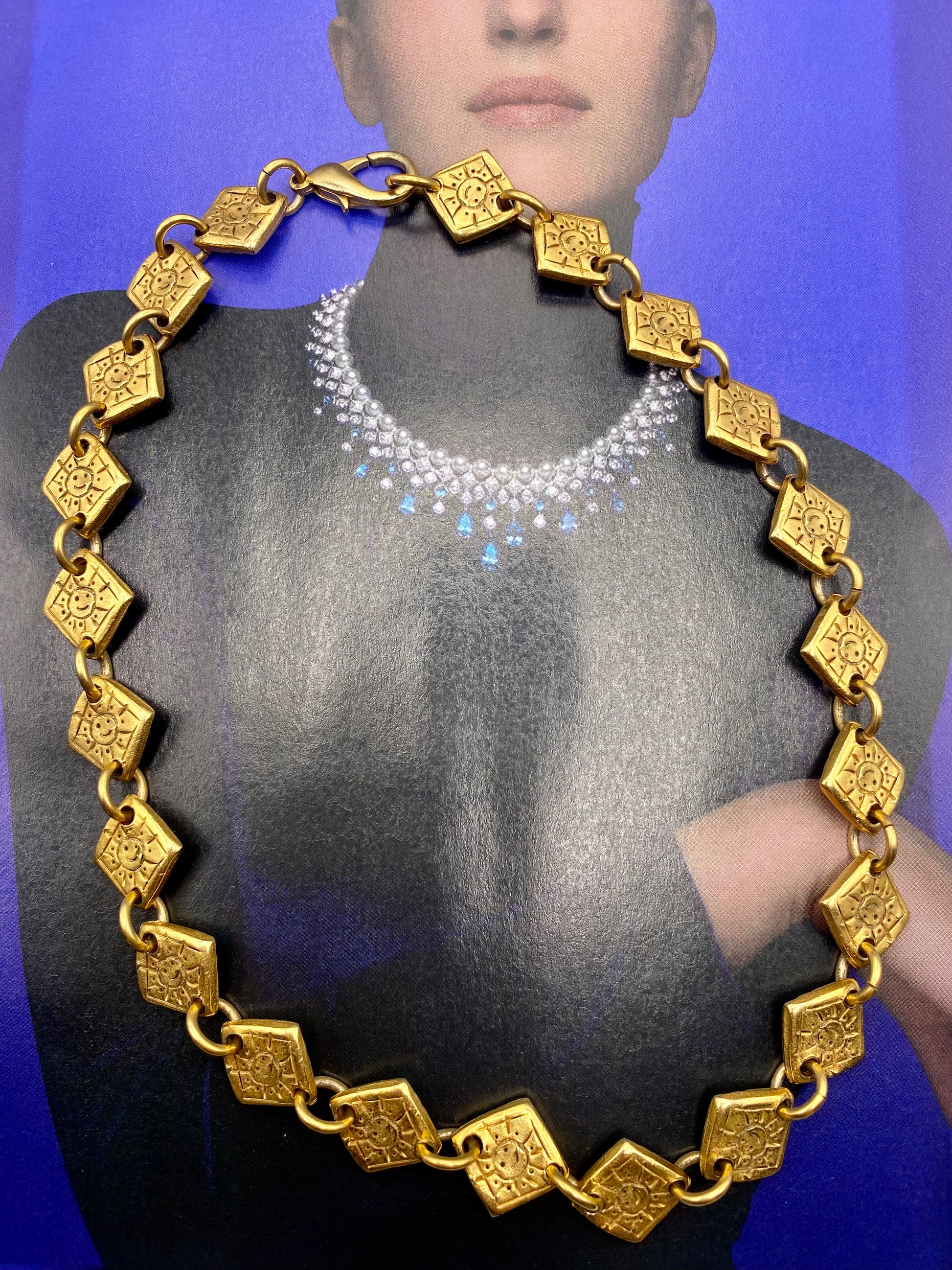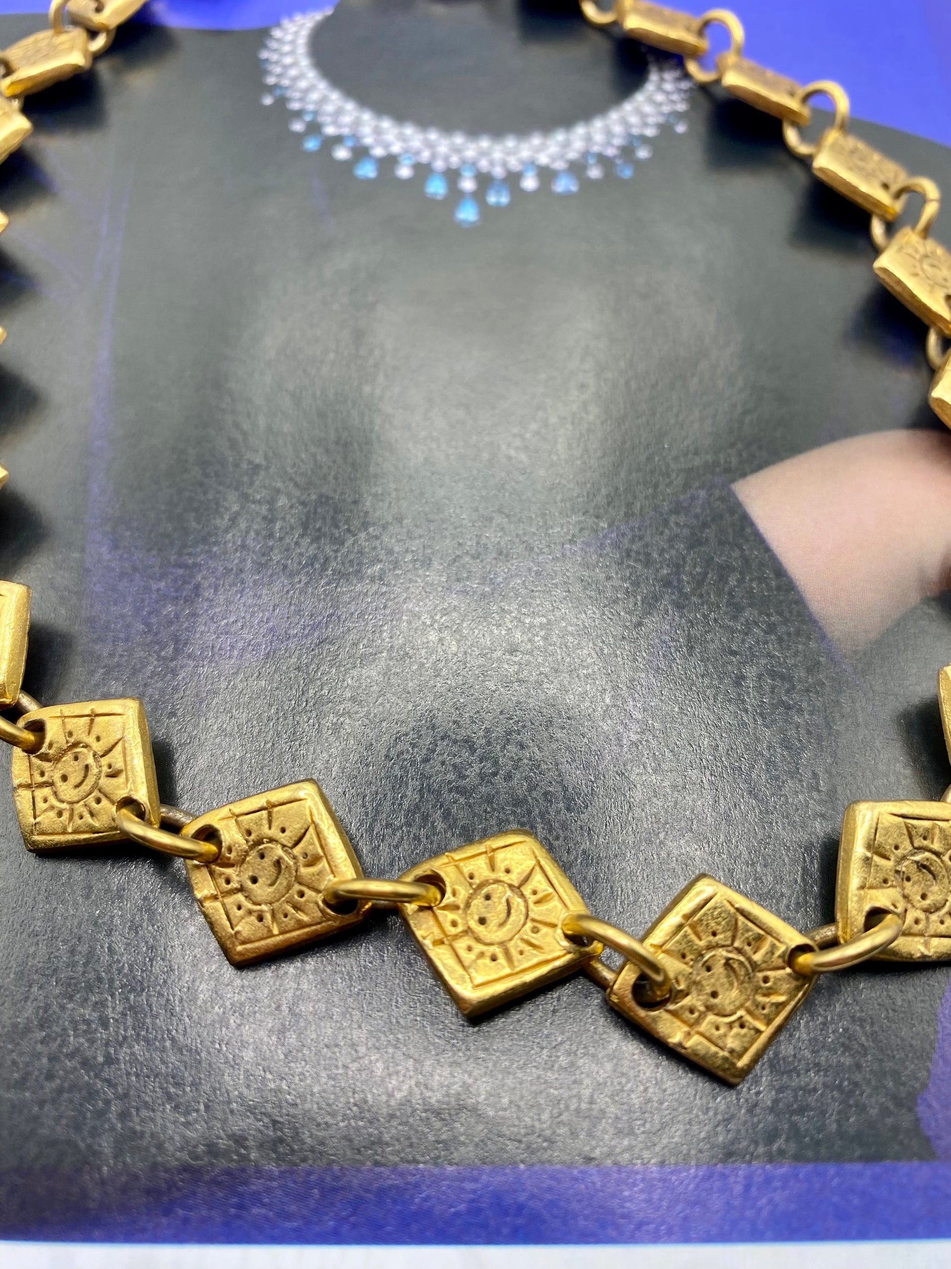 FR/ Collier en plaqué or signé « D’ella Paris » gravé d’un soleil sur chaque maillon. Une pièce si jolie et délicate. J’adore ce soleil très enfantin, cette pièce est joyeuse et solaire.