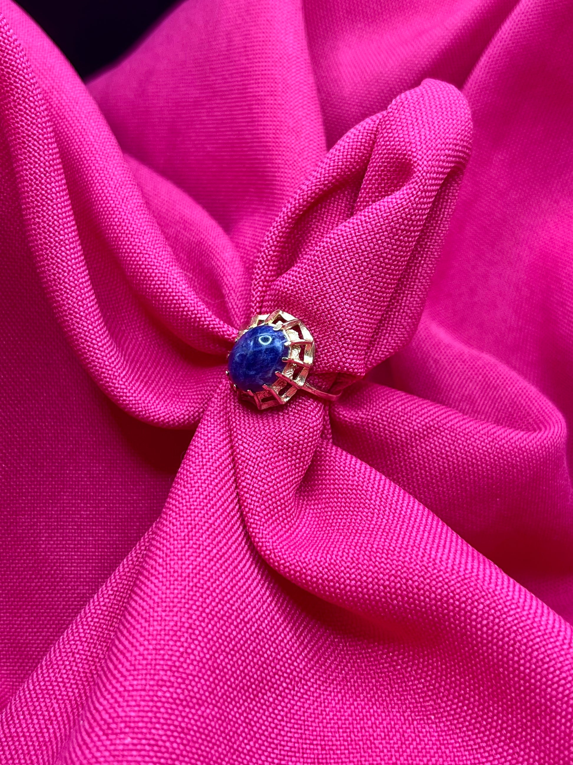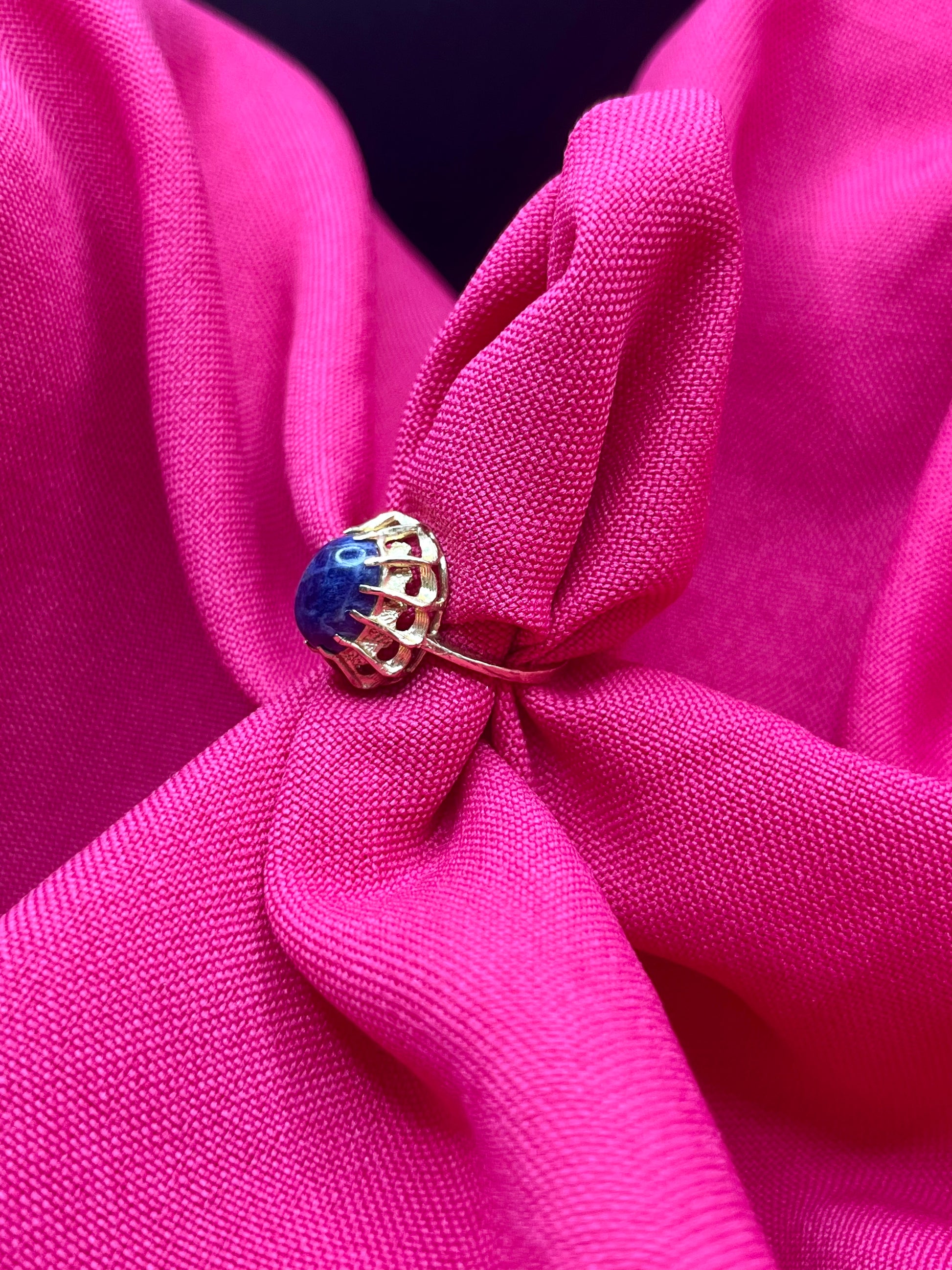 Bague dôme en plaqué or 9 carats d’une forme délicate, sertie d’une grosse pierre bleue marbré. Un modèle assez hors du commun.