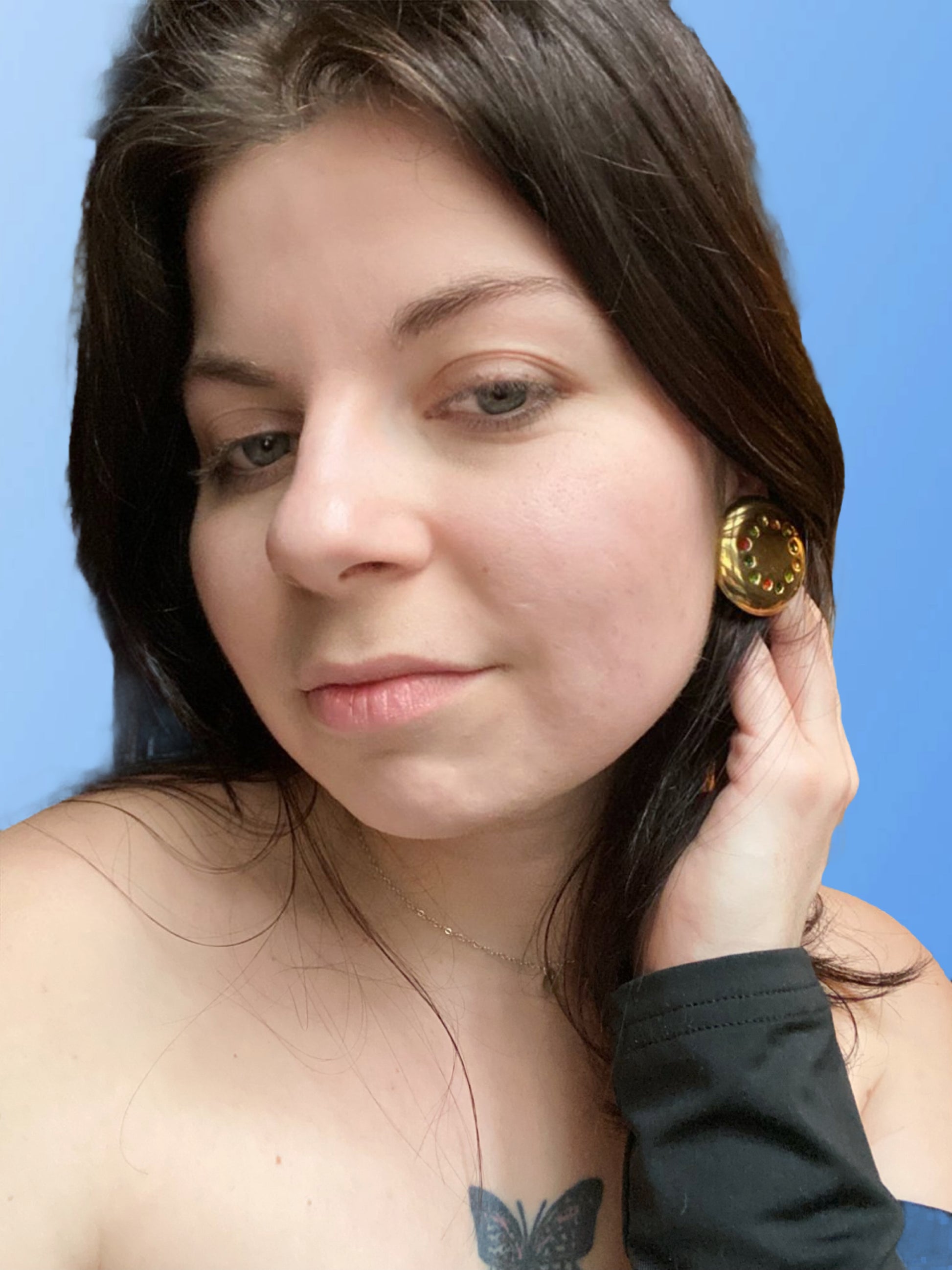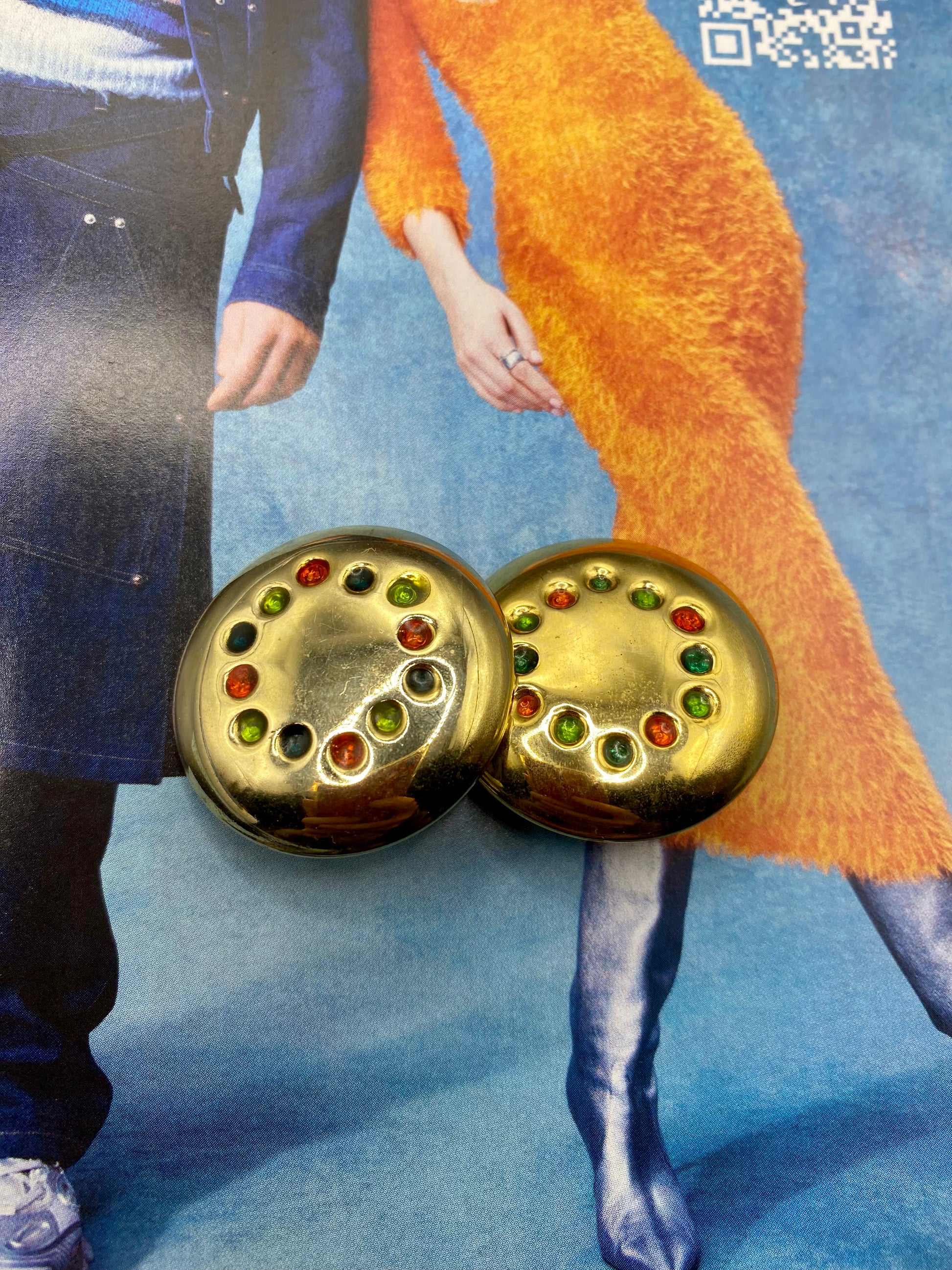 FR/ Cette paire de clips rondes des années 80 en acier couleur or avec des strass de trois couleurs différentes sont fun et chic! Pour un look vintage et original.
