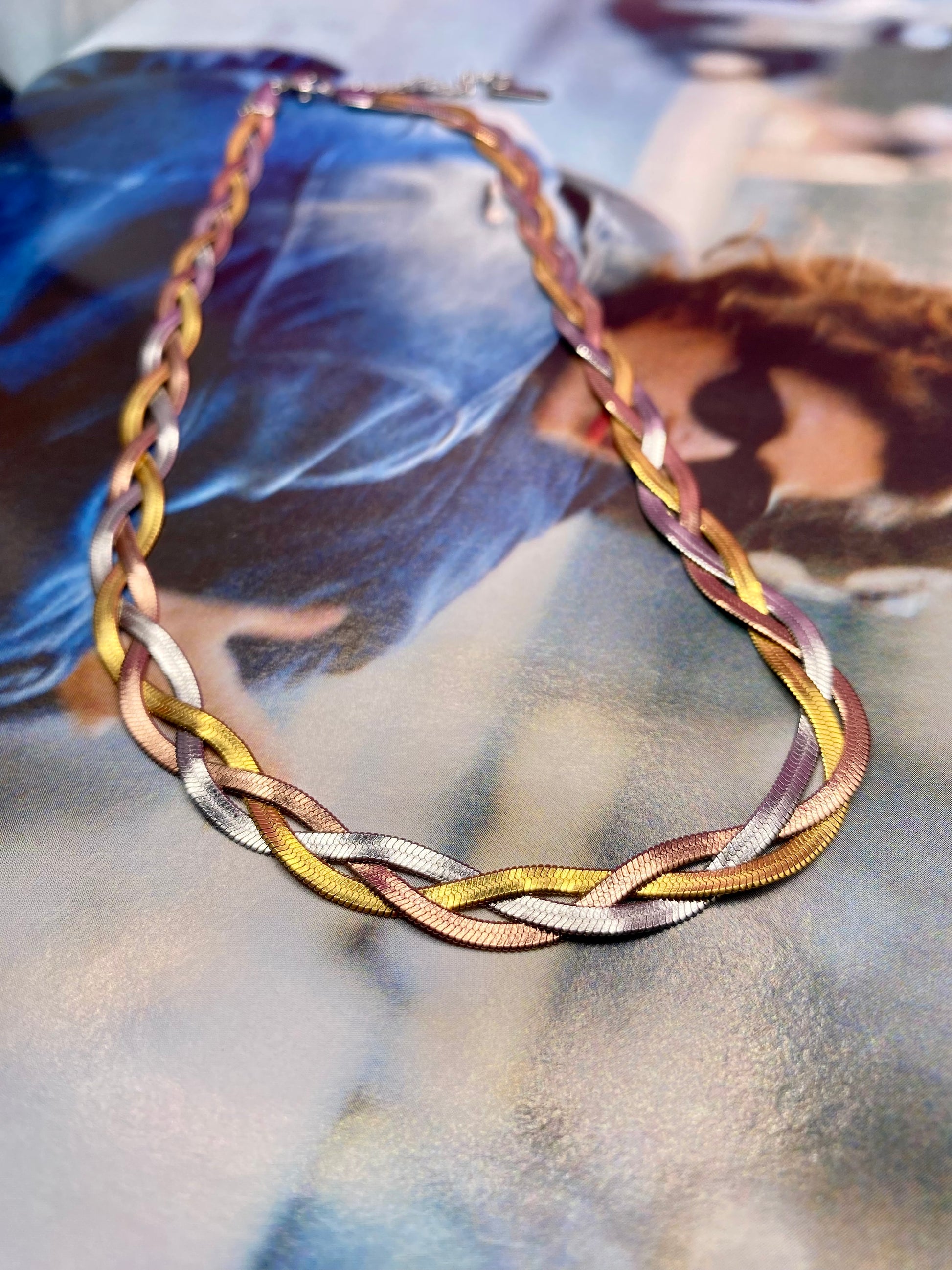 FR/Chaîne tressée en argent, plaqué or et plaqué or rose. Cette chaîne qui s’entre lasse avec trois coloris est devenu un indispensable pour les accumulations ou pour être le bijou parfait pour rehausser une tenue.