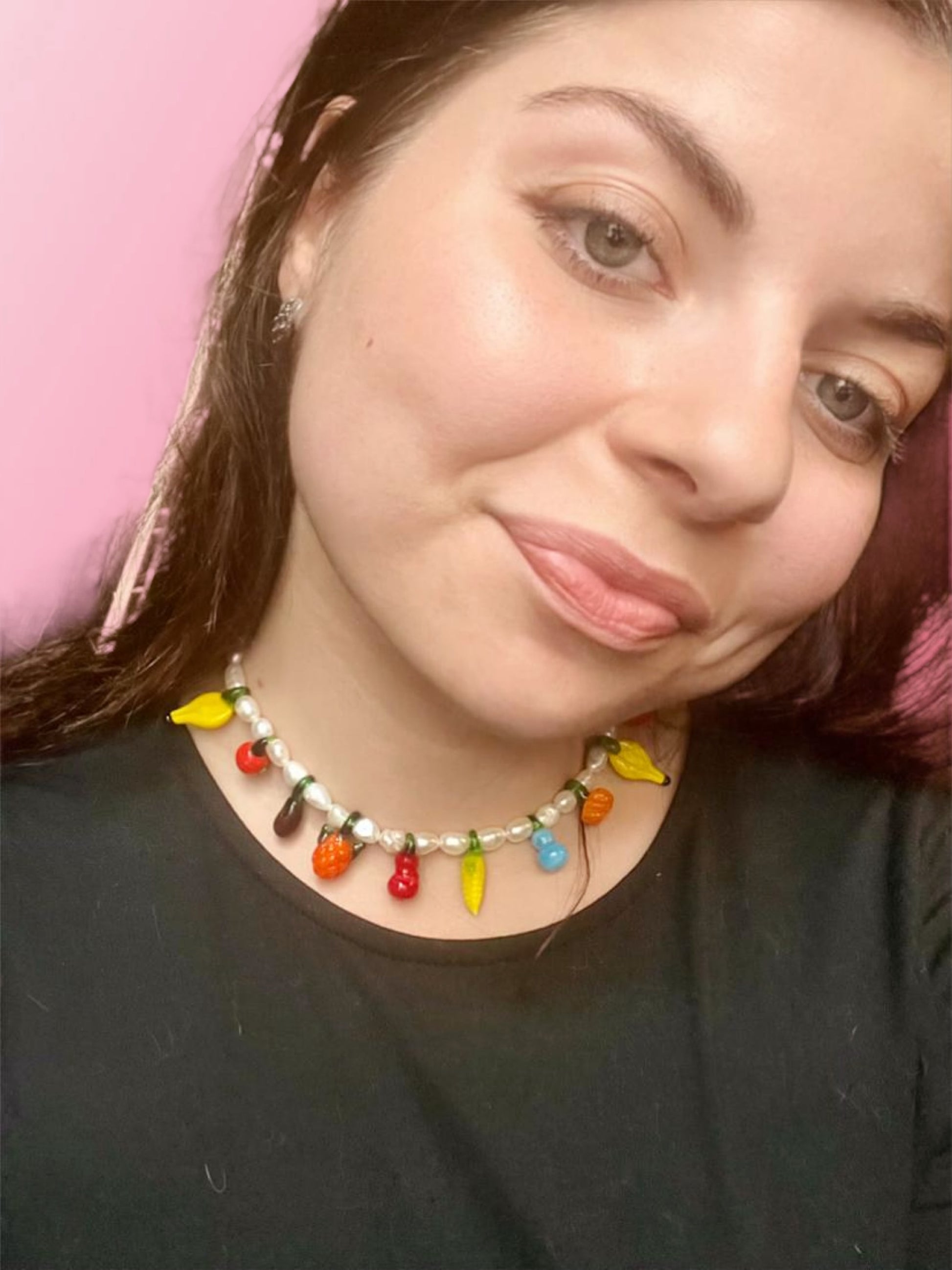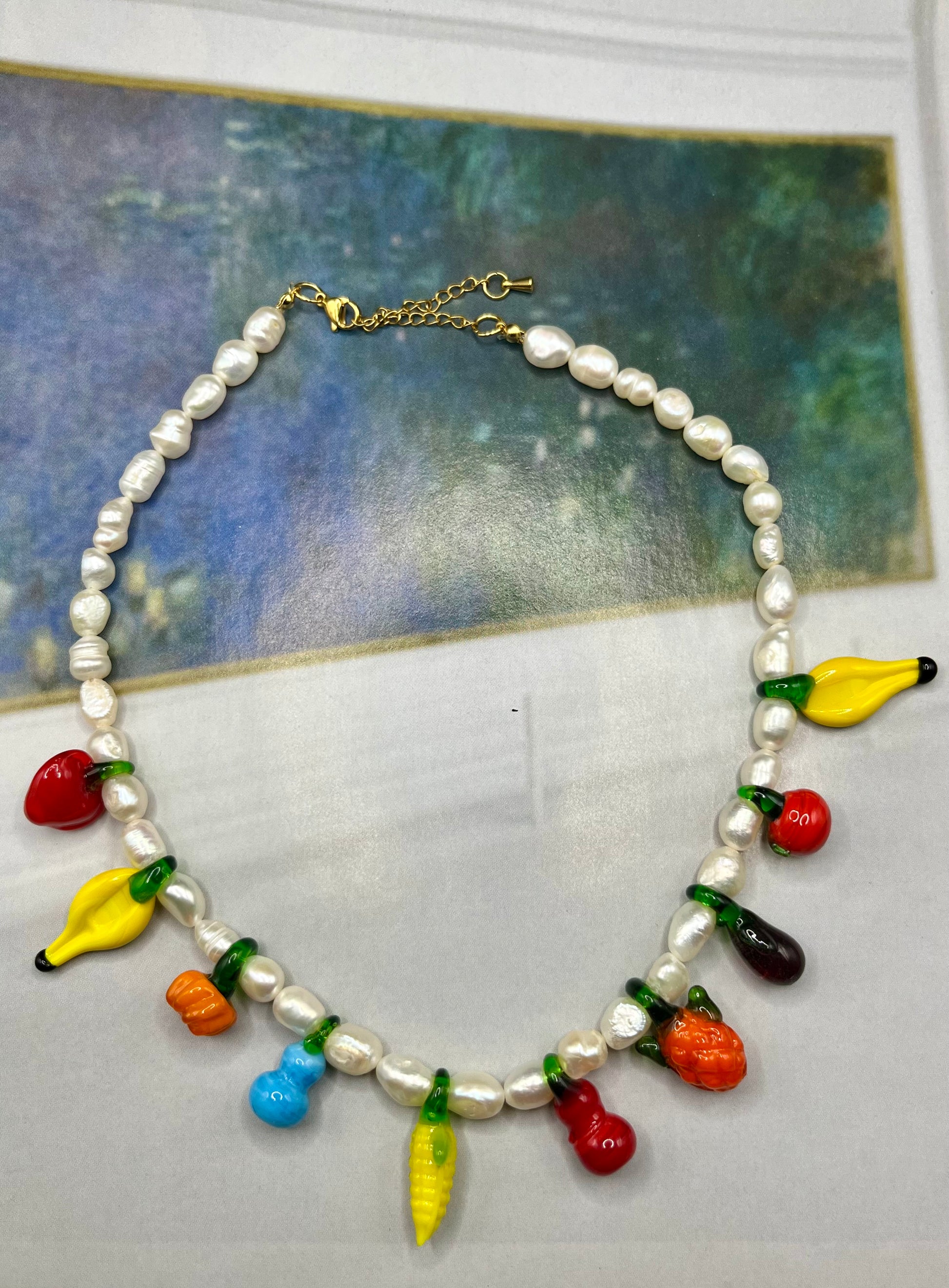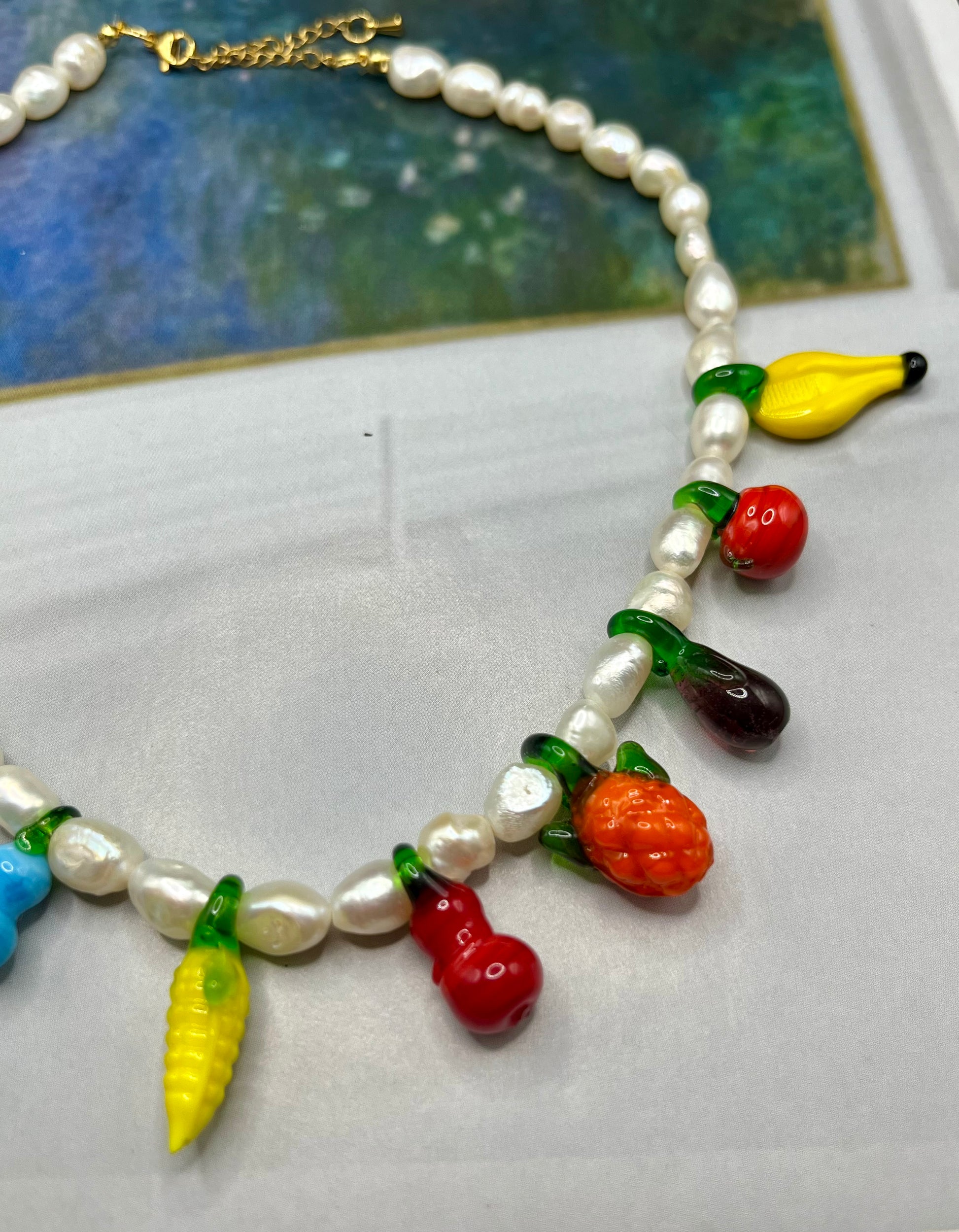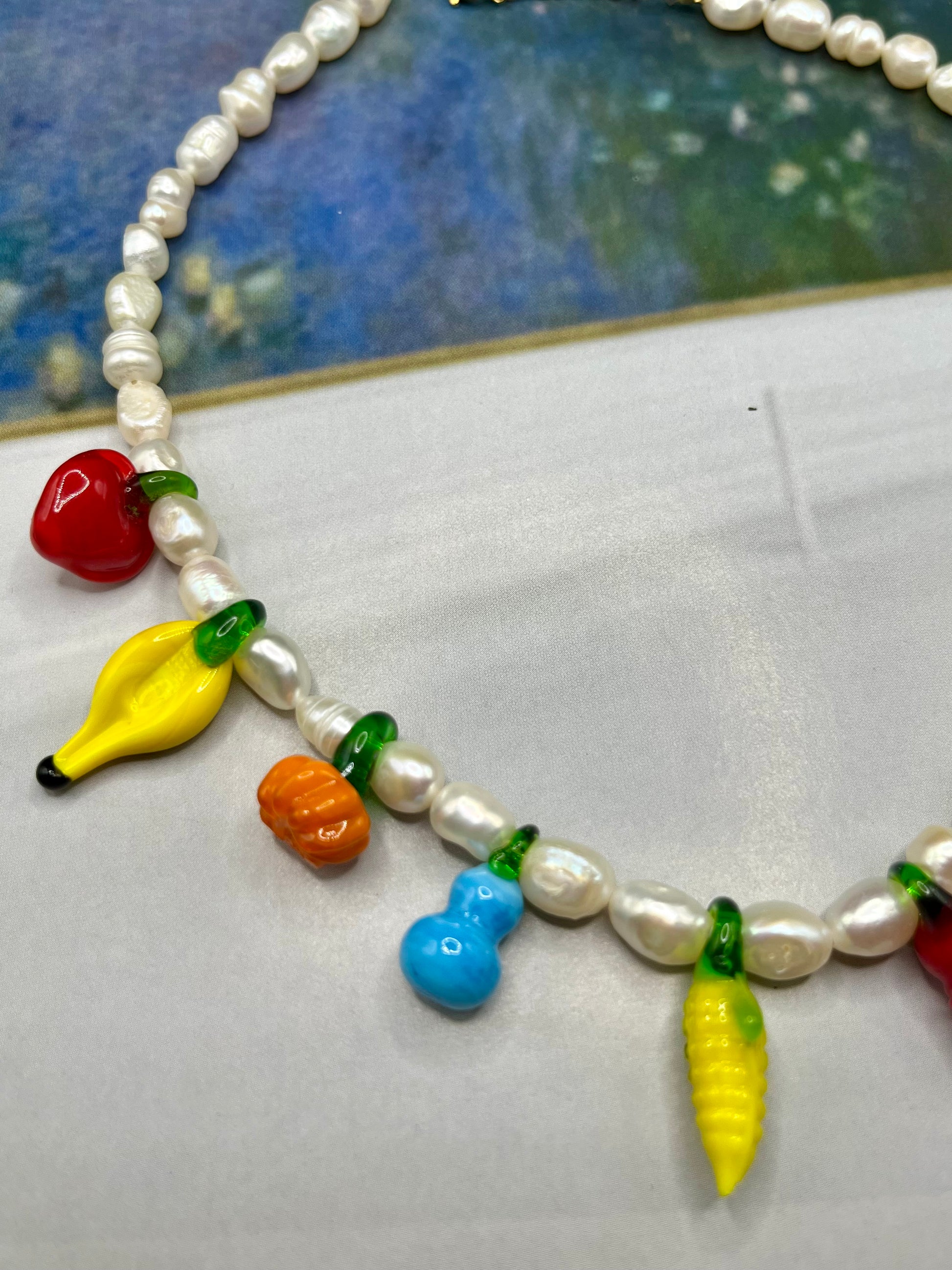 EN/ This fun and colorful piece is also of a very good quality. The fruits and vegetables are made of glass paste, the shapes are worked, and they are real pearls.