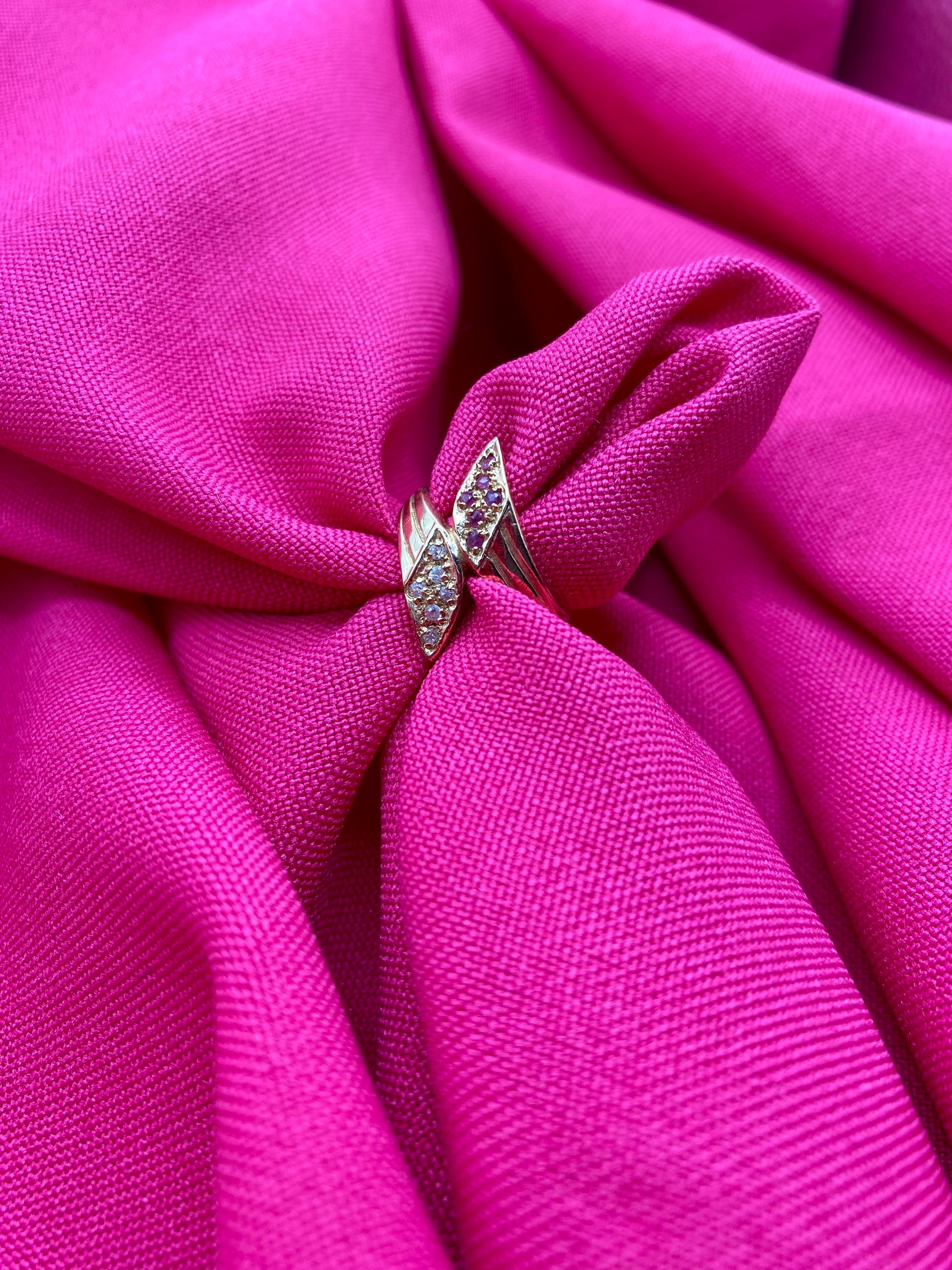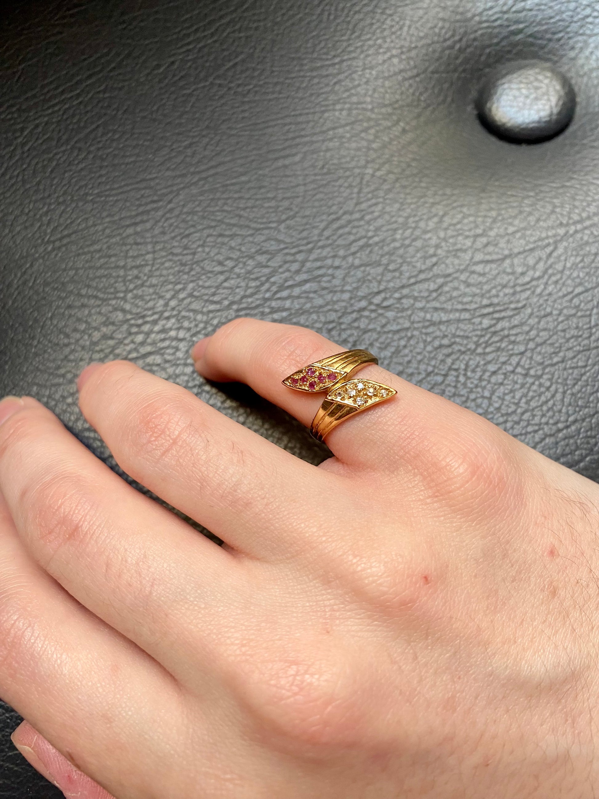 FR/ Bague des années 80 en plaqué or sertie de zirconiums blancs et d’un très joli vieux rose. La délicatesse de cette pièce est sublime.