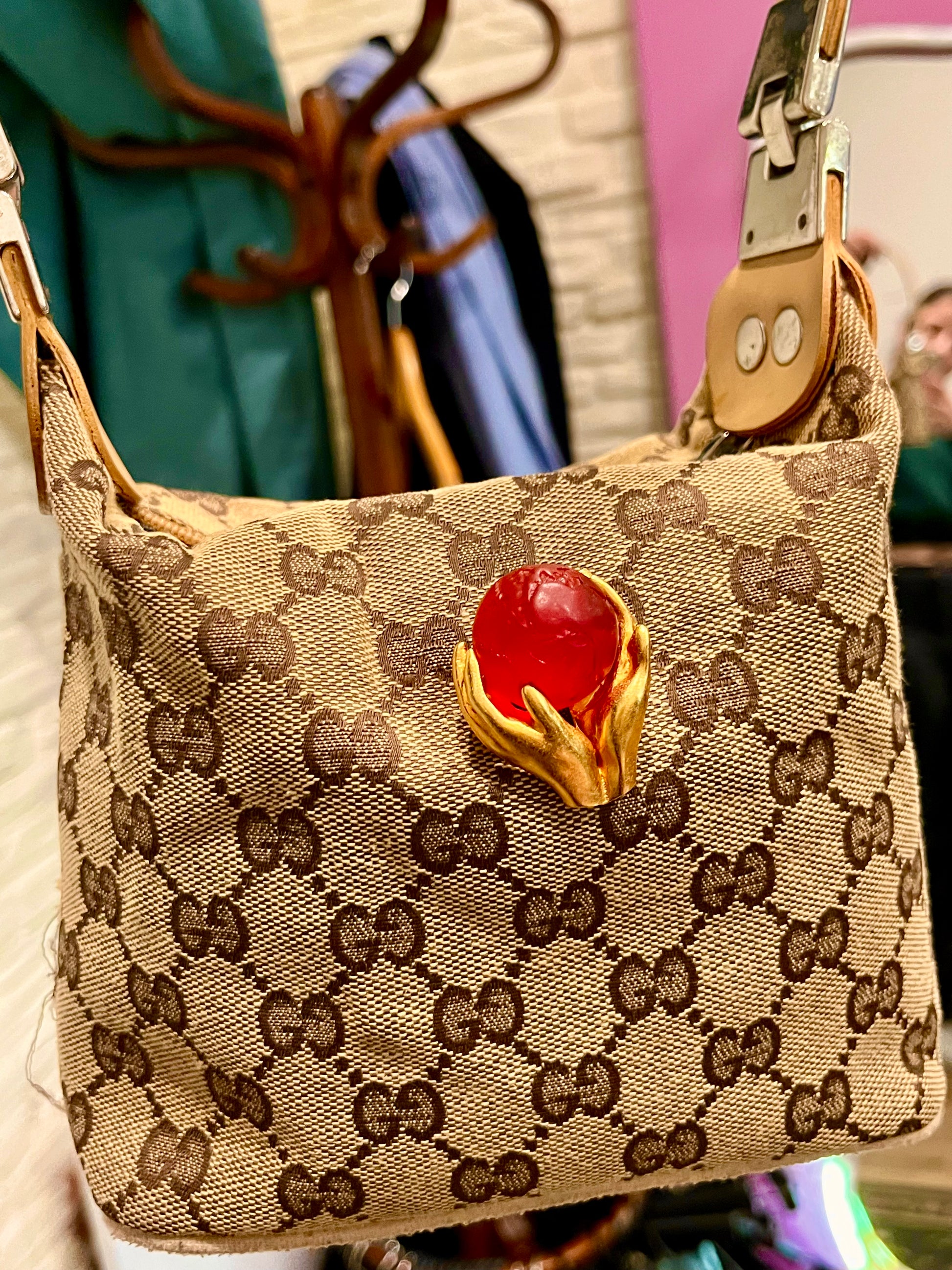 FR/ Une pièce unique et sublime, avec un côté witchy super intéressant. Les matériaux utilisés donne, avec la couleur or matte, un très beau côté couture. Une broche avec beaucoup de caractère, à porter sur un sac, un ruban en chocker, un top, un manteau, une écharpe… 1000 manières de la porter !